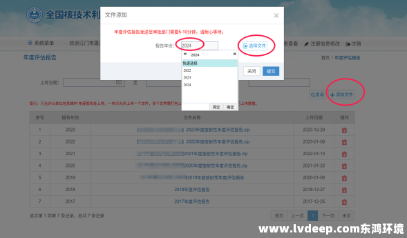 3、選擇添加文件,年份選擇2024年,將“年度評(píng)估報(bào)告表+環(huán)境輻射監(jiān)測(cè)報(bào)告+個(gè)人劑量檢測(cè)報(bào)告”整體打包上傳,最后點(diǎn)提交。